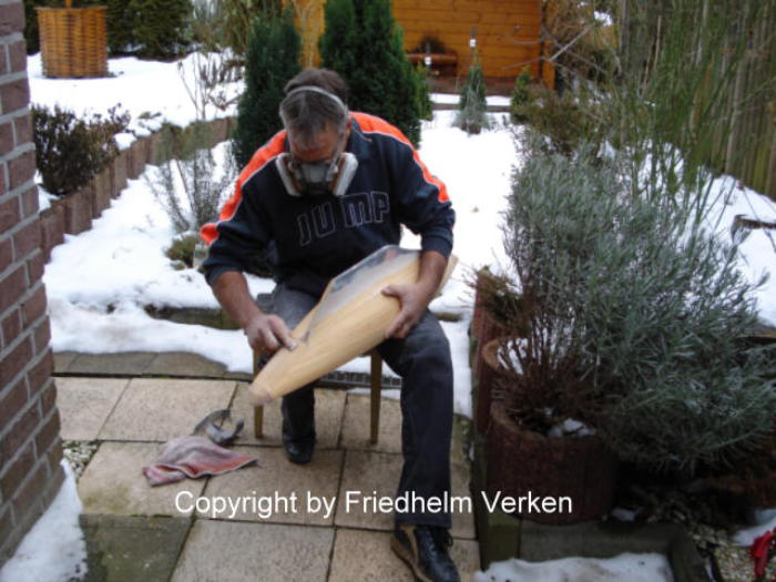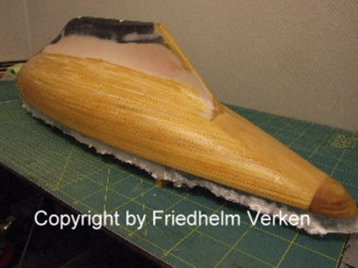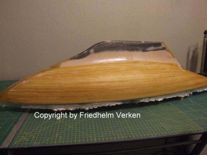 Der Rumpf wurde danach mit zwei Lagen 49 g/m² Glasfilamentgewebe überzogen. Würde man nur Grundierung und Farbe auftragen wären bei Temperatur-
