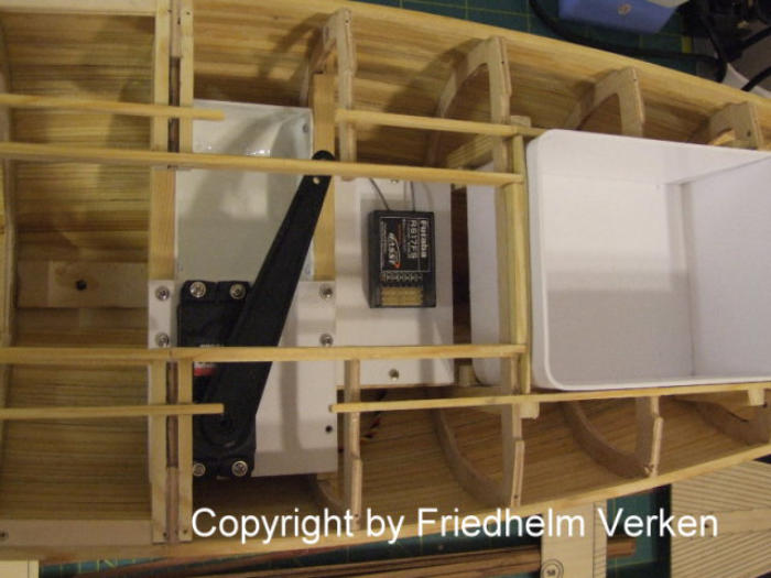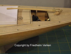 werden. Danach fertigte ich für das Innere die Cockpitschale und die Halterung des Segelverstellservos. Die Empfängerhalterung und das Batteriefach sind auch