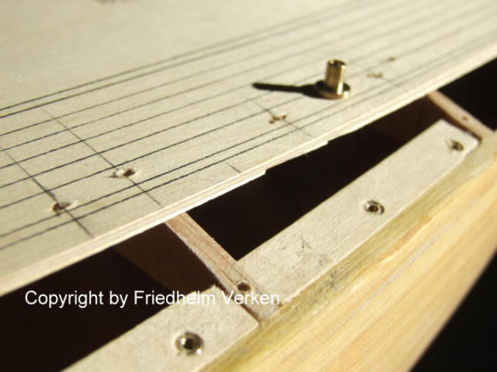 ich die Position neu festlegen. Die beiden Sperrholzhälften montierte ich mit je einer 2 mm Holzschraube pro Spant und wasserfesten Holzleim. Die entstandenen