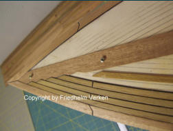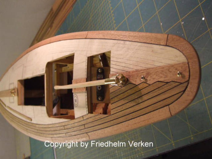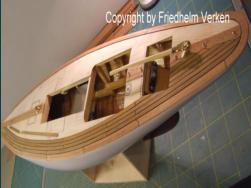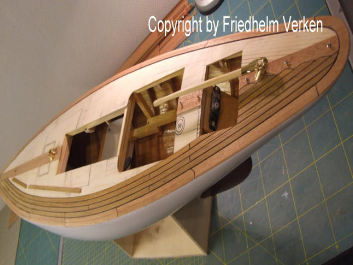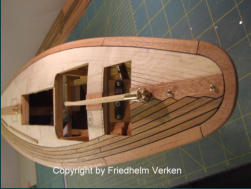 Vierkantleisten verarbeitet. Die Randbeplankung wurde aus Mahagoni-Furnier hergestellt, und später sieben mal mit klarem Bootslack versiegelt. Mit den Leisten