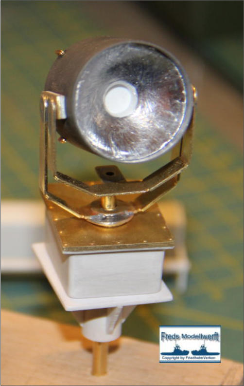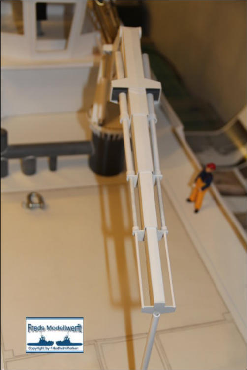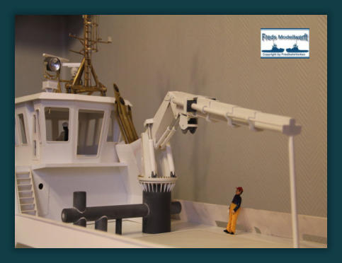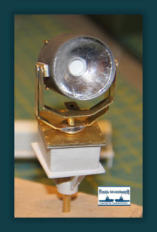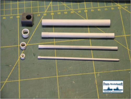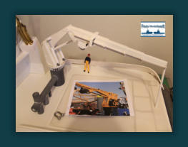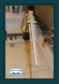 Die Einzelteile für die Ausleger - Hydraulikdämpfer habe ich ausPVC Röhrchen hergestellt und an den Enden um ca. 5 mm breiteund 0,5 mm dicke, für den jeweiligen “vorigen” Innendurchmesser,aufgedickt. Dazu habe ich einfach ein Stück Rohr aufgeklebtund es dann auf den passenden Durchmesser dünner gedreht. Die PVC Ringe sind bis auf den Letzten nur für die Optik. Der letzte Ring hat innen einen Ansatz damit das Teilstück nicht herausfällt. Die Kranrolle und Halterung habe ich nach Original Fotos angefertigt, denn auch sie unterscheidet sich von der Smit Bronco. Die beiden Seematz Scheinwerfer sind Bausätze der Firma Graupner, die ich etwas verändern musste um an dieOriginal Optik der Beluga Scheinwerfer zu kommen. So habe ich den Lampenkorpus und den -fuss erneuert. Zusätzlich habeich auf dem weißen Reflektor Silberfolie aufgeklebt.