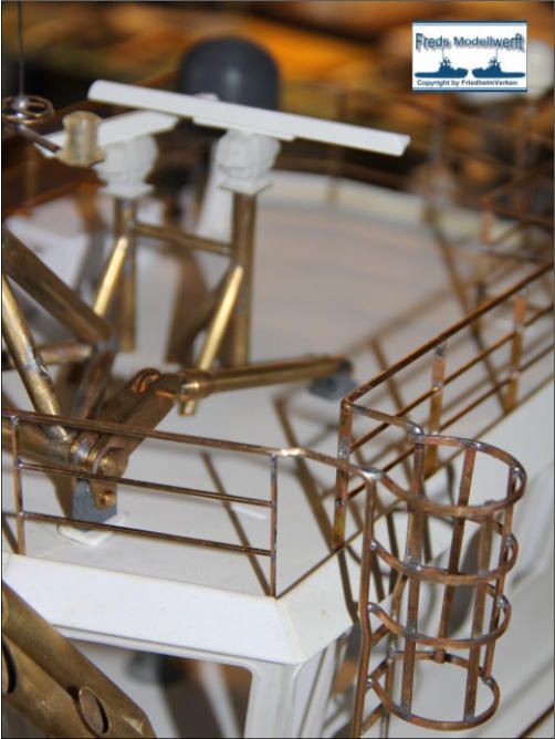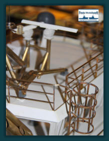 ...Über die Anfertigung von Reling und Relingstützen muss man nicht viel schreiben...Das die obere Reling immer 0,5 mm dicker ist, der Optik wegen, braucht man auch nichtzwingend zu erwähnen. Außer das es auch hier nützlich sein kann, angrenzende Lötteilemit Metallklemmen zu versehen, um das Abfallen der zu lötenden Teile zu vermeiden.