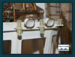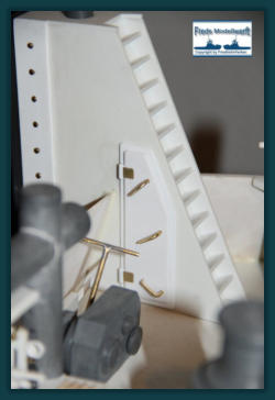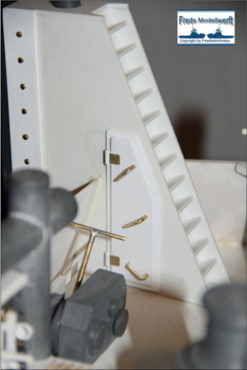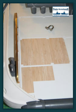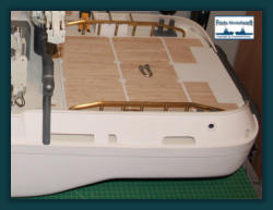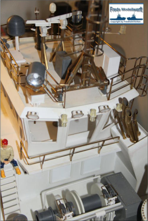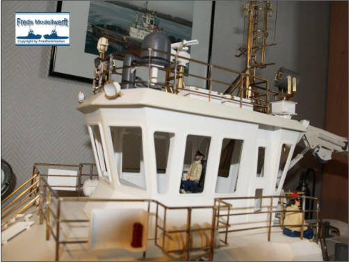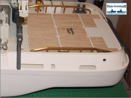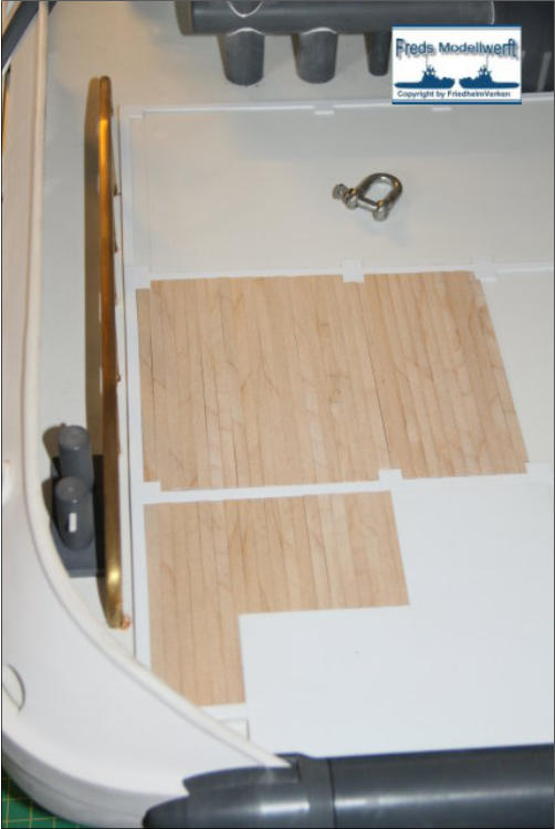 Das Arbeitsdeck wurde mit 139...! 5 x 1 mm Ahornleisten beplankt. Um hässliche Klebefleckenzu vermeiden habe ich die Leisten vorher von beiden Seiten mit mattem klaren Lack bestrichen.Die Bug und Heckstrahler sowie die Schlepplichtersind Fertigteile aus dem Hause “Modellbau Kaufhaus”Die beiden Türen in den Innenseiten der Stoßhörner habe ich wie üblich aus Polystyrol zurecht geschnitten, aufeinander geklebt und mit Scharnieren und Luken Griffeaus Messing bestückt.