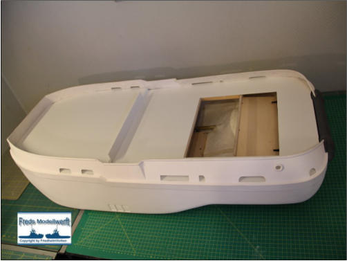 vor der Arbeitsdecks-Öffnung die Verstärkung für den Kran und seine Mechanik eingeklebt.