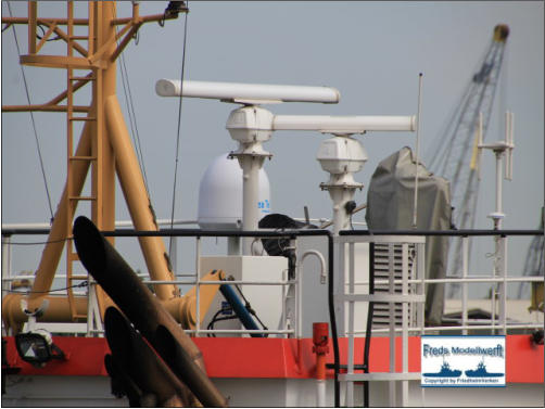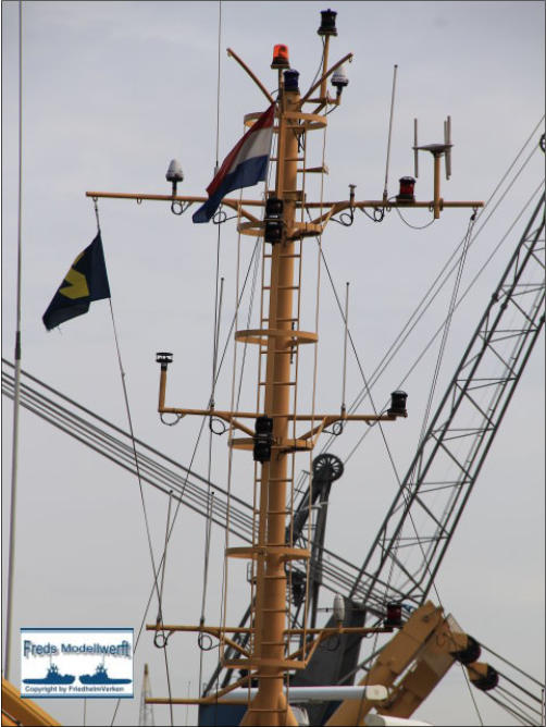 Die größeren Teile des Antennenmast wurden hart und die kleinen Teile weich gelötet. Dies hatte den Vorteil, dass beim Anbringen der Kleinteile die Großen auf Grund der höheren Löttemperatur nicht wieder auseinander gingen. Um benachbarte Kleinteile beim Löten vor dem Abfallen zu schützen, hilft eine Metallklemme. Diese lenkt die “Hitze” auf sich und schützt so das Kleinteil. Der fertige Antennenmast wurde vom 1. Maschinisten “abgenommen” ;-)Radarmast und die beiden großen Kamine wurden ebenfalls aus Messingrohr mit einander hart verlötet.